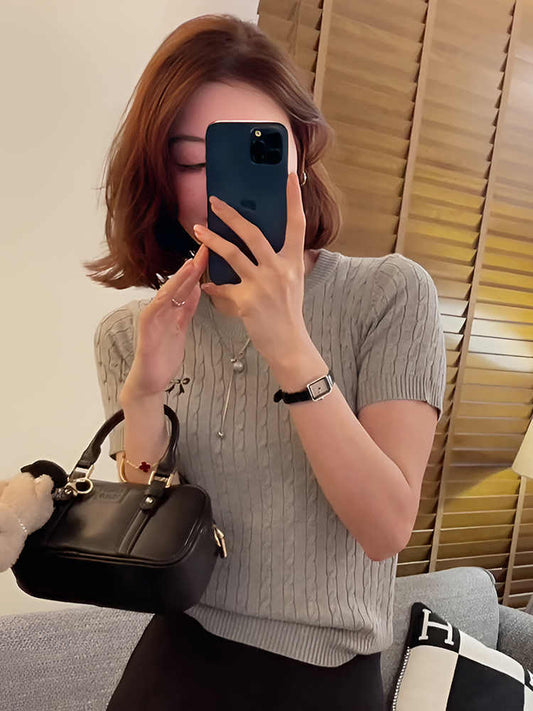 All-matching Pullover Bow Embroidery Twist Knitted Short Sleeve