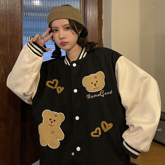 Girls’ Bear Baseball Jacket – Embroidered & Aesthetic