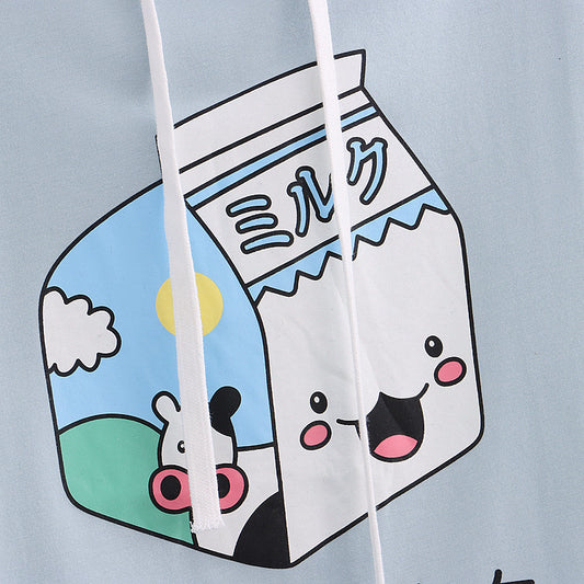 Childlike Sweet Milk Carton Print Hooded Colorblock Short Sleeve Hoodie