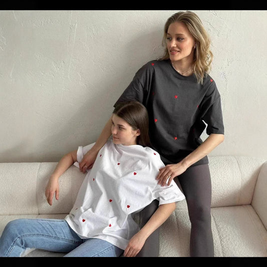 Lace-up Flower Embroidery Cotton Loose Short-sleeved T-shirt Women