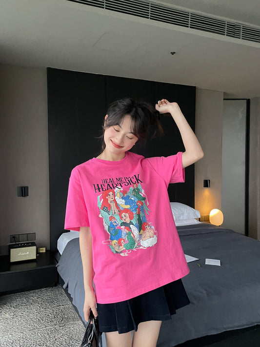 All-matching Fashion Girl Printed Pattern Round Neck Short Sleeve